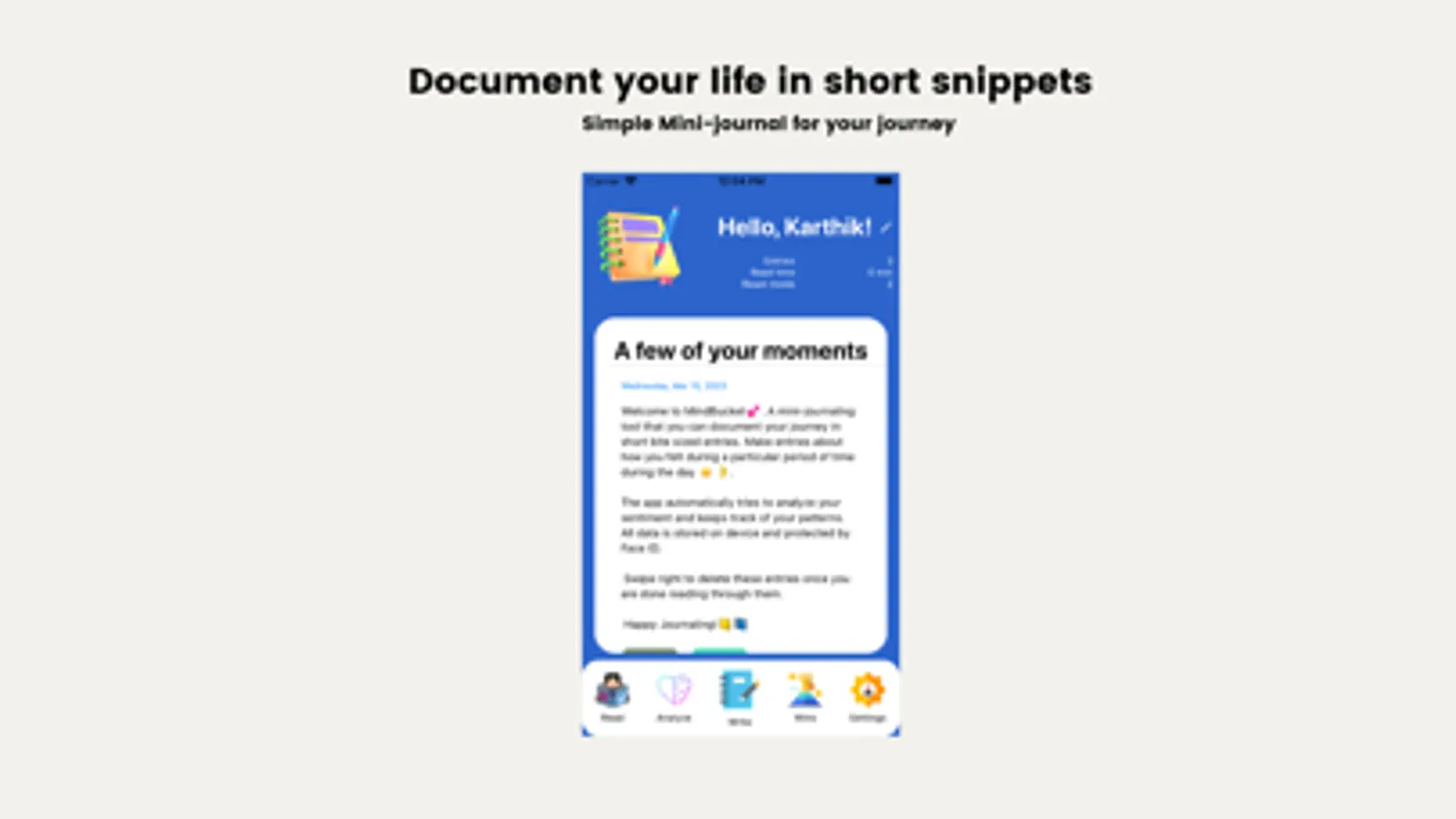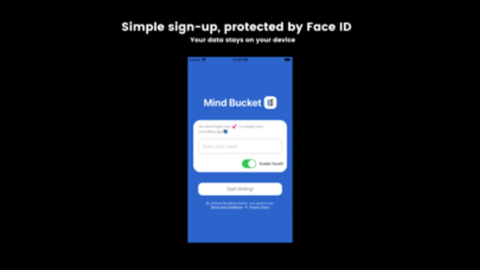 With Mindbucket, all of your data stays on your device, ensuring that your journal entries remain private and secure. And with the added protection of faceID, you can rest assured that your personal information is always safe and secure.