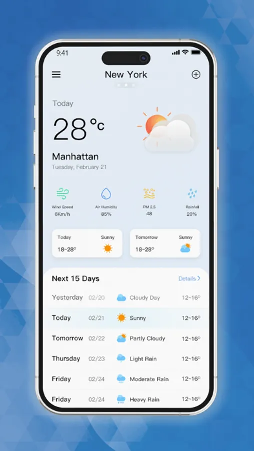 Basic Features. Detailed 24-hour weather forecast to keep you up to date with the day's weather news. Forecast the weather for the next 15 days, so you can plan your trip 15 days in advance.