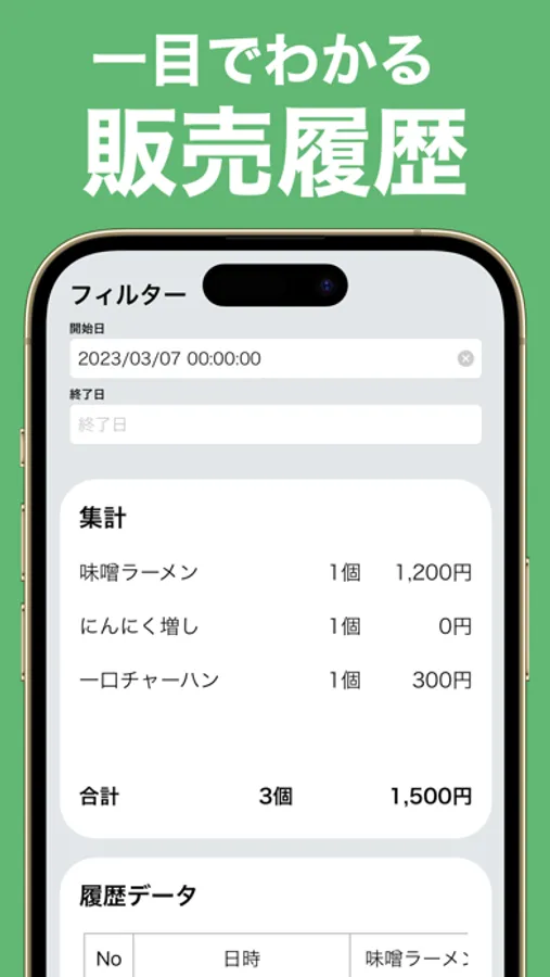日付でフィルターをする事ができるので「今日の売り上げだけ」「今月の売り上げだけ」など自由自在!