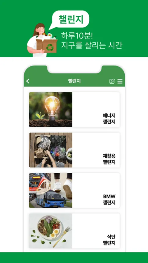 다양한 챌린지를 통해 환경 보호 실천을 유도하고 관리합니다.