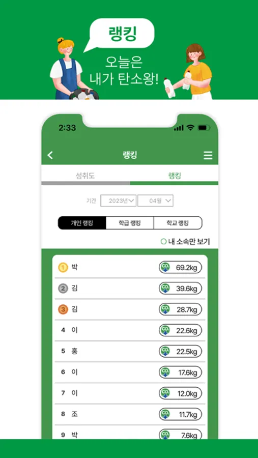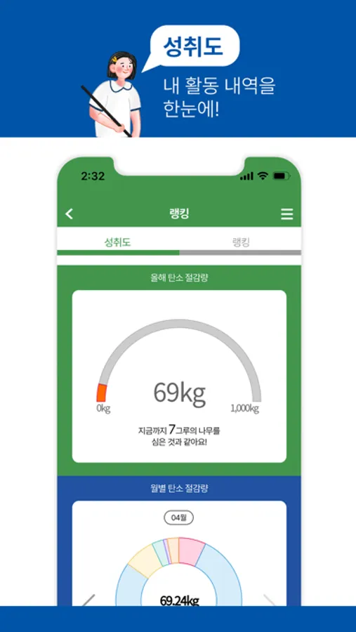 나의 활동으로 절감한 탄소량이 월별, 년도별로 노출되고 개인랭킹, 전국 학교나 단체 랭킹을 확인할 수 있습니다.