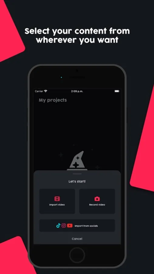 The application is designed to import your video from your gallery, record with the camera or import directly from Tiktok, Instagram and Youtube.