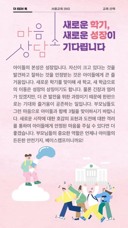 『지금 서울교육』은 서울교육 현장의 모습을 더욱 임팩트 있게, 교육정보의 전문성은 더욱 깊이 있게 소통하고, 꿈꾸며, 상생하고, 공존하는 서울교육의 이야기를 전합니다. 서울교육의 가치와 능력을 소통하는 더 SEN 톡, 상생과 혁신으로 미래 학교의 모습을 꿈꾸는 서울교육 ING, 생각을 확산해 함께 어울리고 성장할 수 있는 교육 산책 섹션으로 구성돼 있습니다.