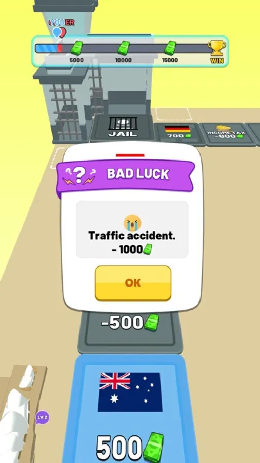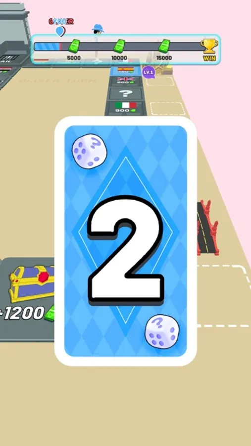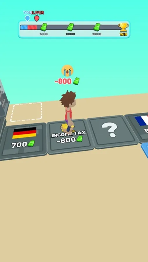 Choose card to move. Occupy and upgrade area to get more toll. Face mysterious situation. Keep moving forward until one got 20k.