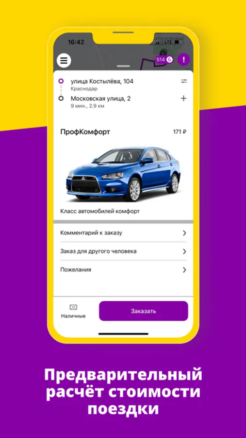 - Заказ авто в несколько кликов. Отметьте точку на карте, не нужно писать длинный адрес вручную;