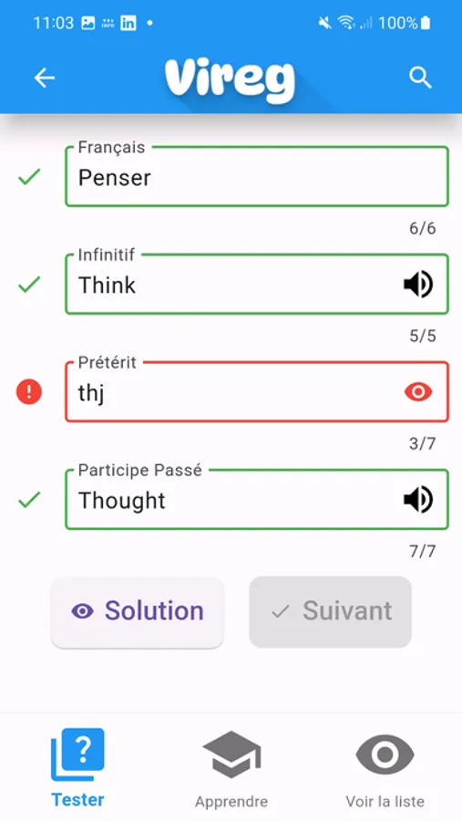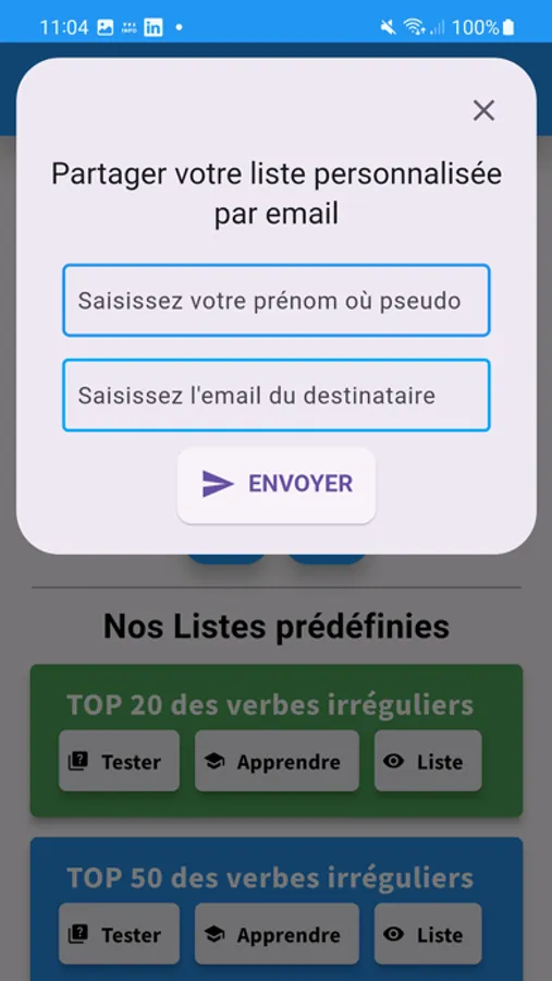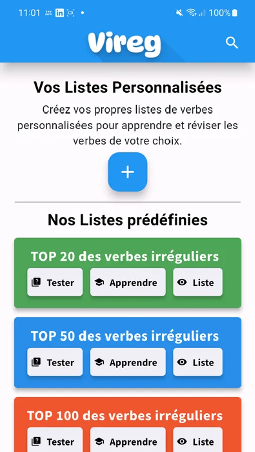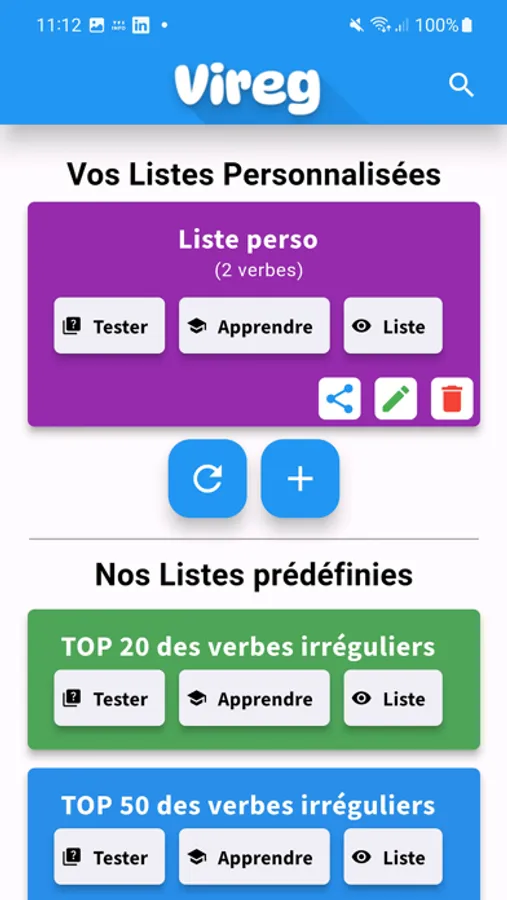 Vous pouvez aussi créer vos propres listes afin d’étudier la listes des verbes que vous souhaitez apprendre ou renforcer, vous pouvez aussi les partager avec des amis ou vos élèves.