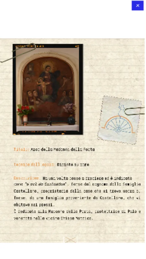 Applicazione di Realtà Aumentata per le edicole votive di Palo del Colle. In corrispondenza delle edicole votive sono stati posizionati dei beacons. Quando l'utente si trova in prossimità delle edicole, vengono visualizzati dei pannelli informativi relativi alla specifica edicola. Nel caso in cui il dispositivo non dispone di tecnologia bluetooth è possibile utilizzare la fotocamera, scansionare un QR Code e visualizzare lo stesso il pannello informativo.