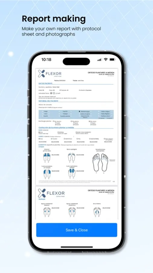 Flexor Scan uses the most advanced technology to create high-precision digital models of feet and legs (until knee) of your patients. The system is able to scan feet, legs and even footprint foams.. Data provided by the APP is transferred together with the medical prescription to Flexor online platform, where the user will be able to download the 3D file, the footprint with measurements and manage orders of your patient’s customized foot orthotics.