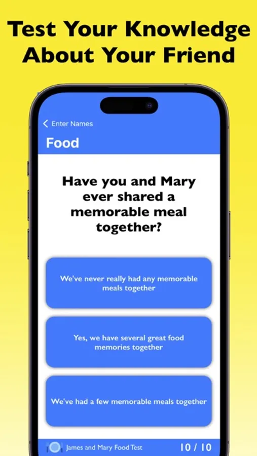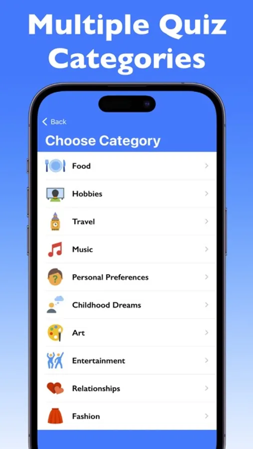 Our Friendship Test app offers various quiz categories, ranging from food, hobbies, travel, and music to personal preferences, childhood dreams, art, entertainment, relationships, and fashion. With over 10 questions in each category, you'll always have interesting and engaging questions to test your friendship.