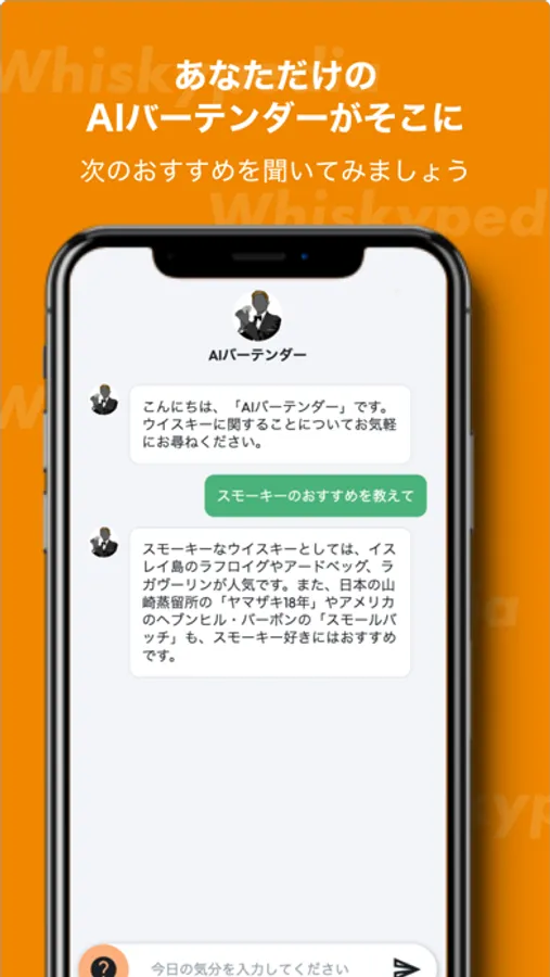 Chat GPTを活用した「AI バーテンダー」に、ウイスキーに関することを会話形式で質問できます。次のおすすめを聞いてみても良いかもしれません。