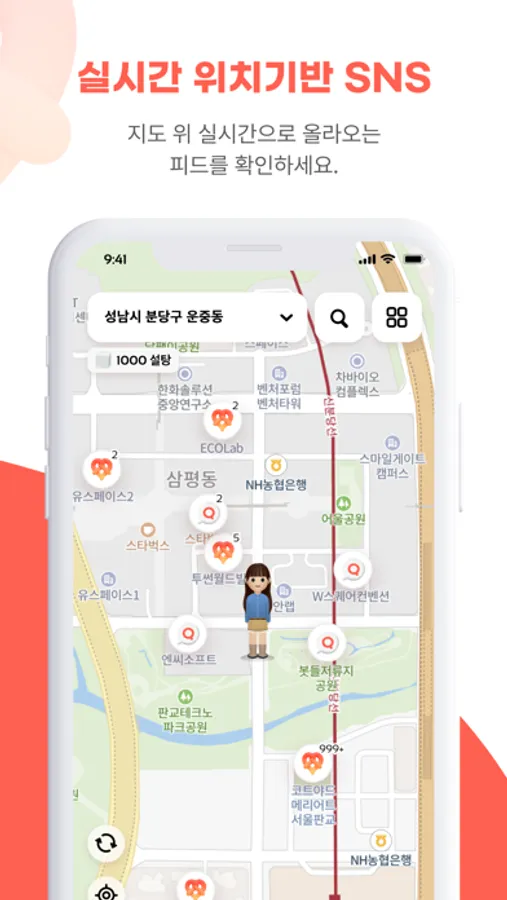 1. 지도 위 프모지를 눌러 나를 닮은 캐릭터를 설정하고, 프로필 소개글을 작성해보세요.