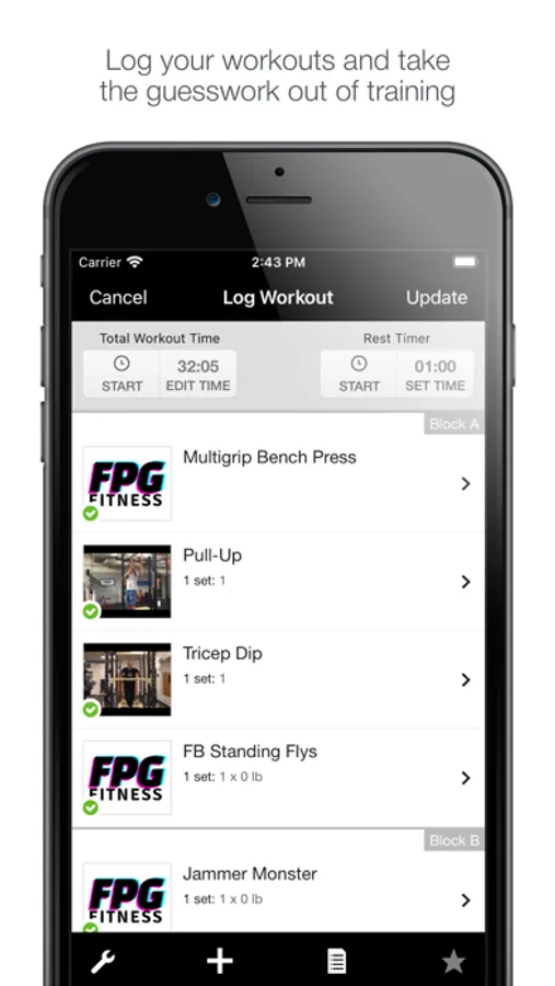 Log your workouts from anywhere with the FPG app! View your logged workouts, see upcoming scheduled workouts, and book appointments inside the app. Track your progress and get the most out of your membership!