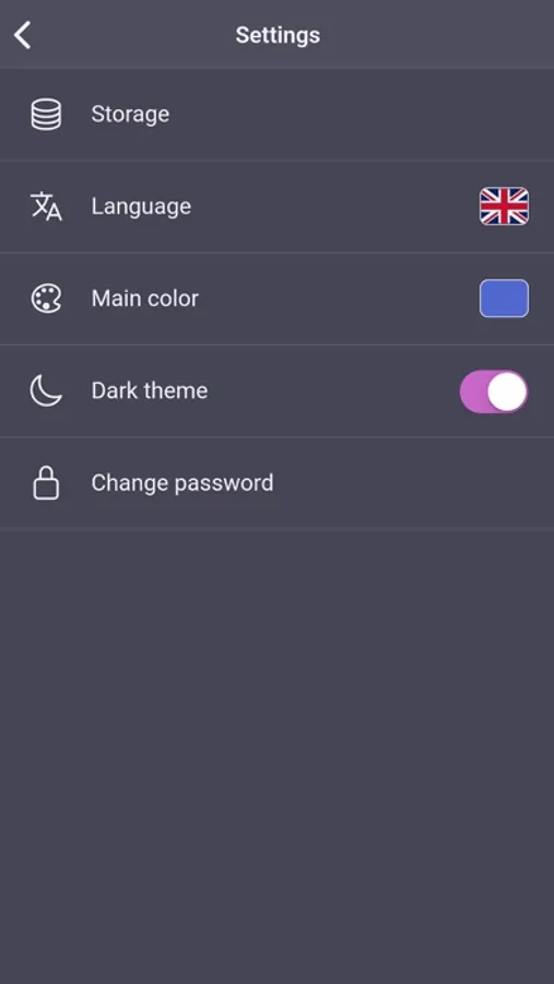 The user password never leaves the app and is not stored, so losing the master password means losing access to the storage.