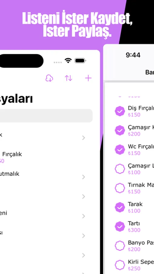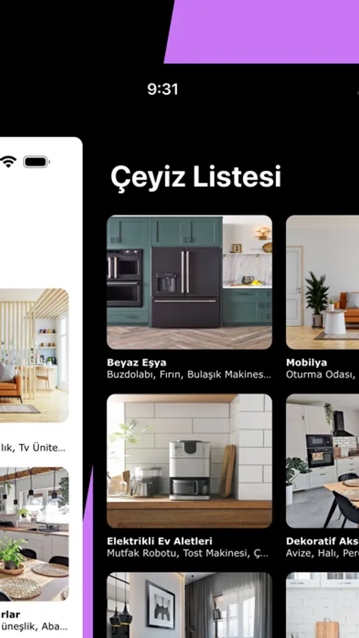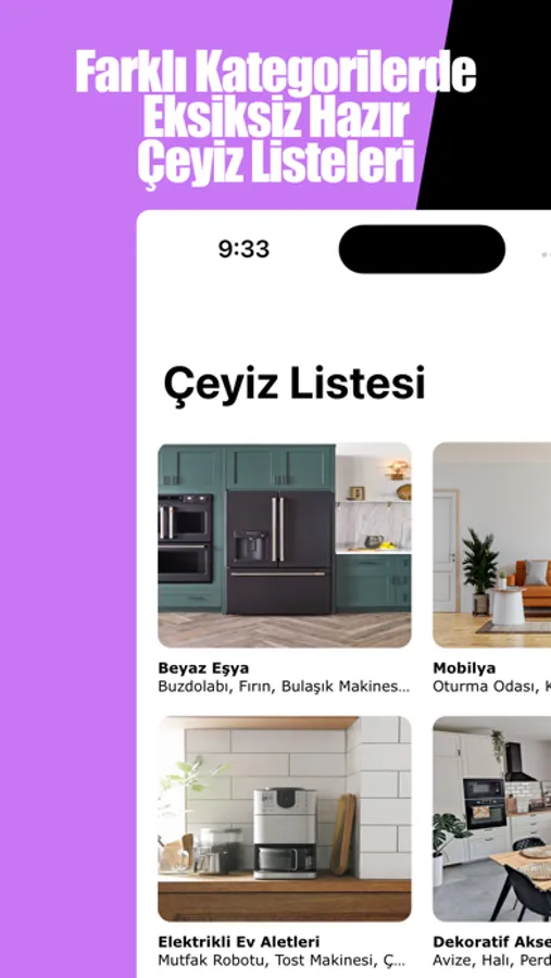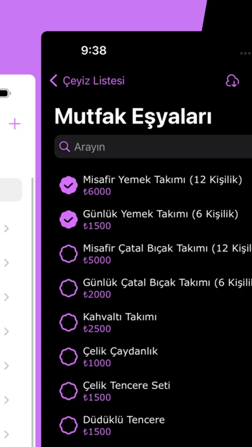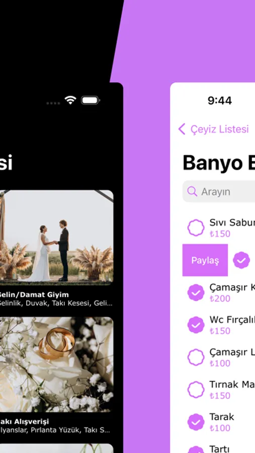 1. Çeyiz Listesi: Tüm düğün ihtiyaçları 8 ana başlık altında toplanmıştır. Listelere ekleme ya da çıkarma yaparak listeleri özelleştirebilirsiniz. Dilerseniz yapmış olduğunuz listeleri paylaşabilir veya kaydedebilirsiniz.