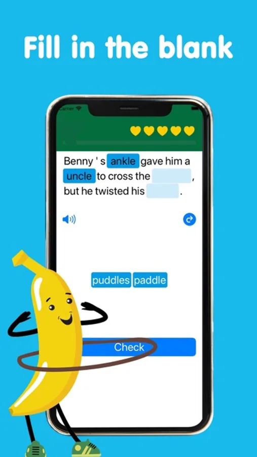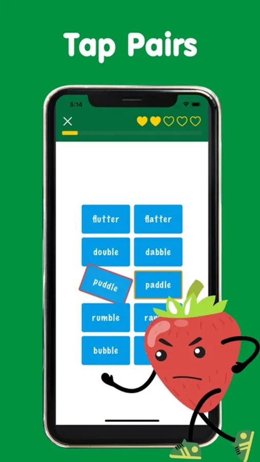 Improve your English skills with just a tap! Pear Up! offers 30 levels of exciting word pairs to challenge your listening and reading abilities. Each level is designed with fun, bite-sized challenges that will test your listening skills and help you learn phonetics-based vocabulary. With hundreds of words and sentences, you'll collect fruit friends along the way and have fun while you learn!