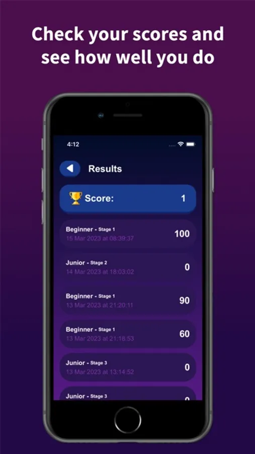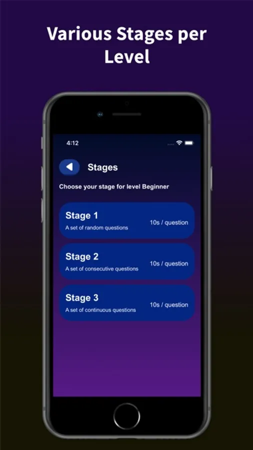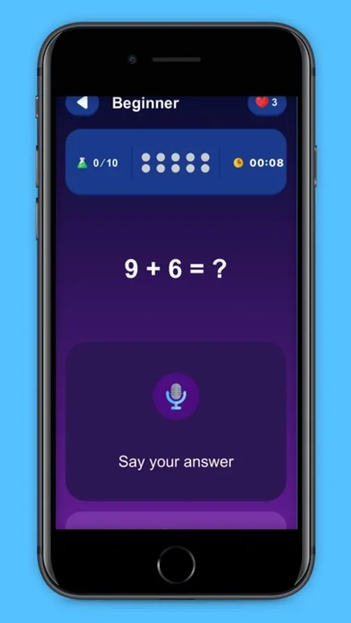 Users can start in the beginner mode, where questions are asked in one digit, and work their way up to Junior, where they start receiving harder questions. Levels and stages are established in a number of digits. Following levels, such as the intermediate and advanced modes, alternate between basic math questions with single-digit and triple-digit answers.