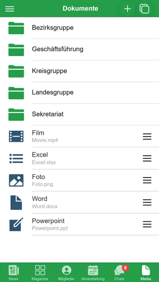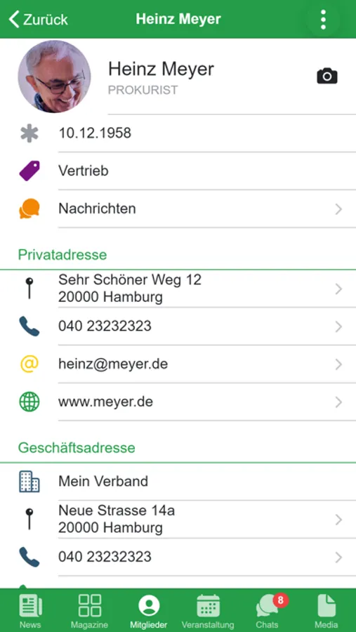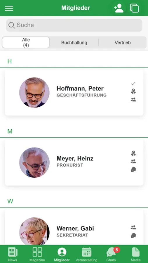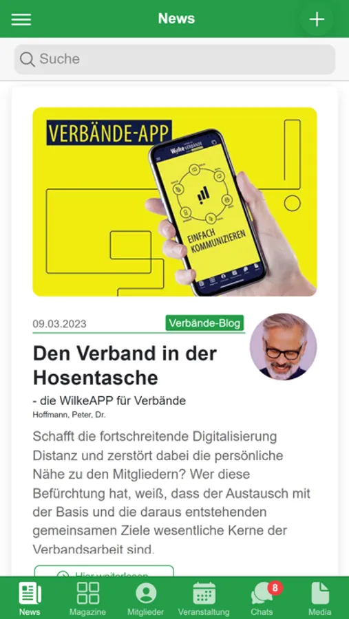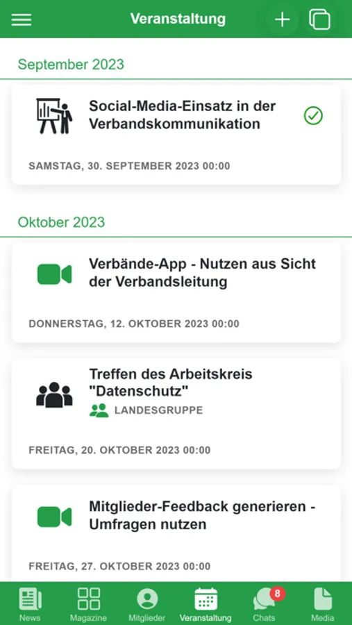 Organisieren Sie Ihr Verbandsleben vollumfänglich digital: Kommunikation von Neuigkeiten und Mitgliederzeitschriften, Verwaltung aller Mitgliederdaten, Erstellung von Projektgruppen, Organisation von Veranstaltungen mit Zu- und Absagen, Einzel-, Gruppen und Organisations-Chat, Bereitstellung von Dokumenten, öffentliche Fotopinnwand und vieles mehr...