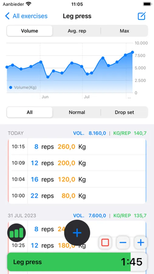 • Graphs: Get in-depth insights into your progress with detailed graphs that show your volume, kg/rep, and max rep.