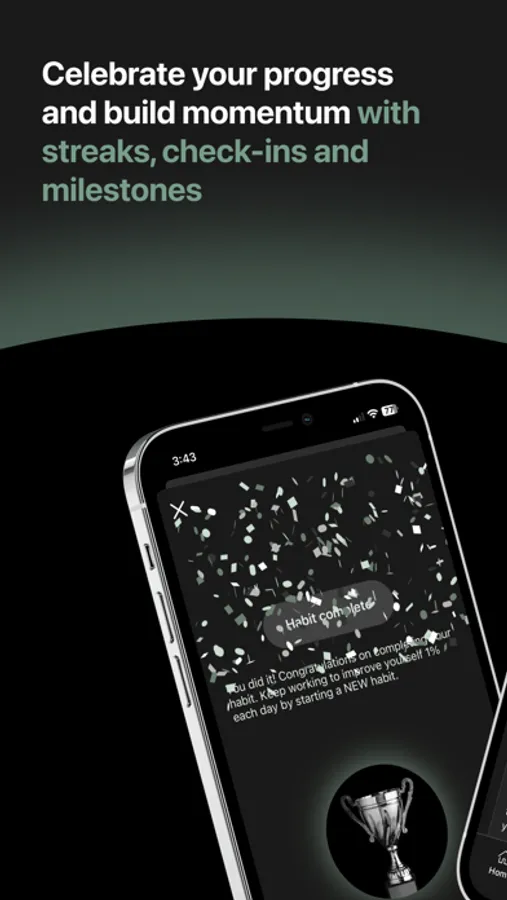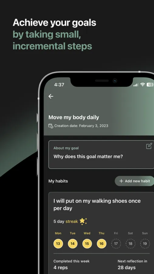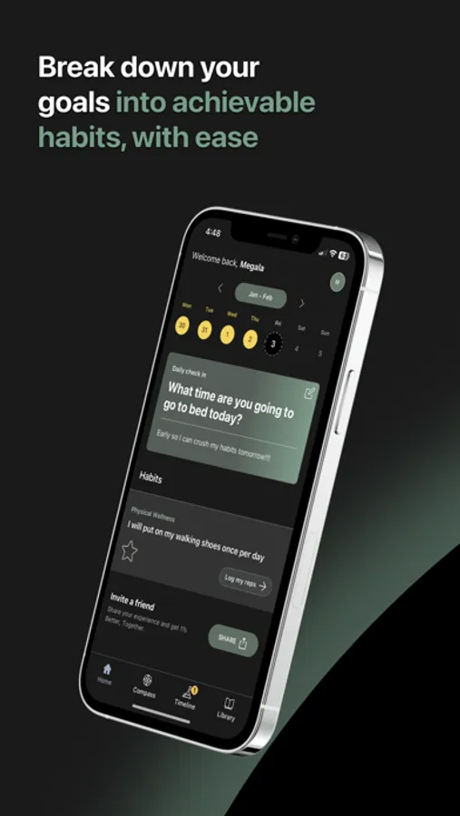 Our app offers a range of features that help you build better habits, including Daily Check-In, Log a Rep, Suggested Articles, Compass, Activity, Library, Streaks, Celebratory Prompts, and Self-Reflections. With our gamification feature, Streaks, you'll enjoy instant gratification when you show consistency with your habits, while Celebratory Prompts keep you motivated with personalized, supportive messages. And with Self-Reflections, you can check in with yourself, while the app learns your patterns to ask more meaningful and timely questions.