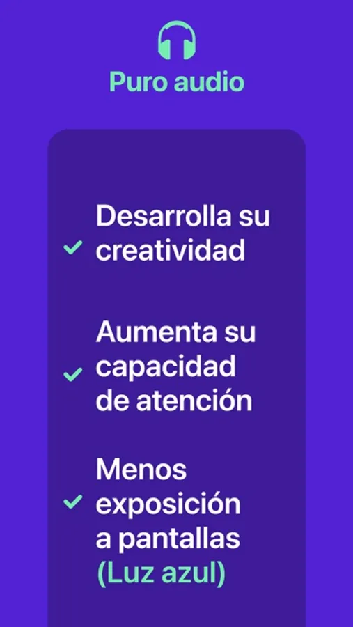 Solo en audio para ayudar a desarrollar su creatividad, aumentar su capacidad de atención y reducir su exposición a pantallas (Luz azul).
