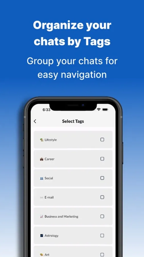 With Askio, you have access to a set of predefined prompts to help you get started. You can also categorize your chats with tags to make it easier to find information later. Plus, our app is user-friendly, so you can get the answers you need quickly and easily.