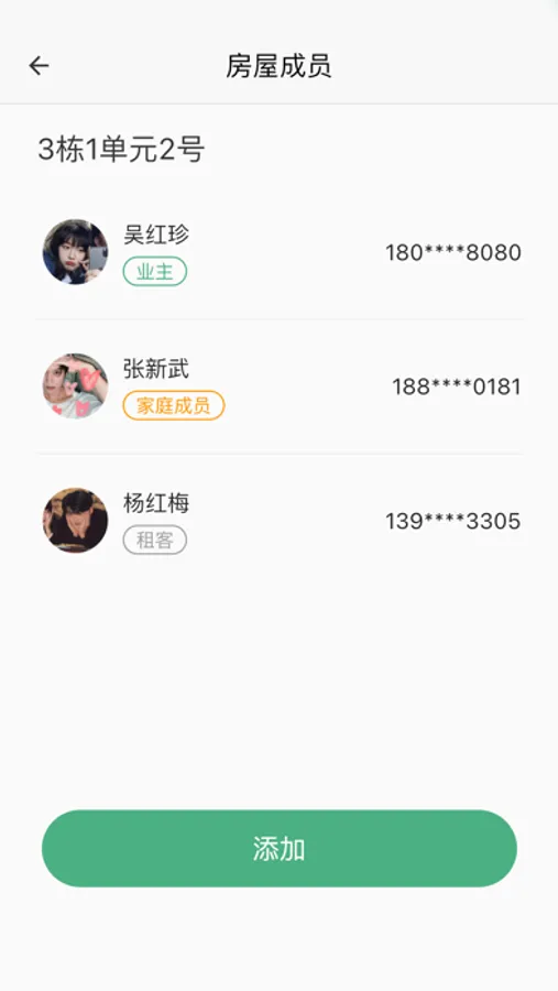 在成员管理页可为该房屋注册新成员,也可在已存在的成员条目上向左滑动,对成员进行删除、修改操作,一起上传该用户的人脸信息。