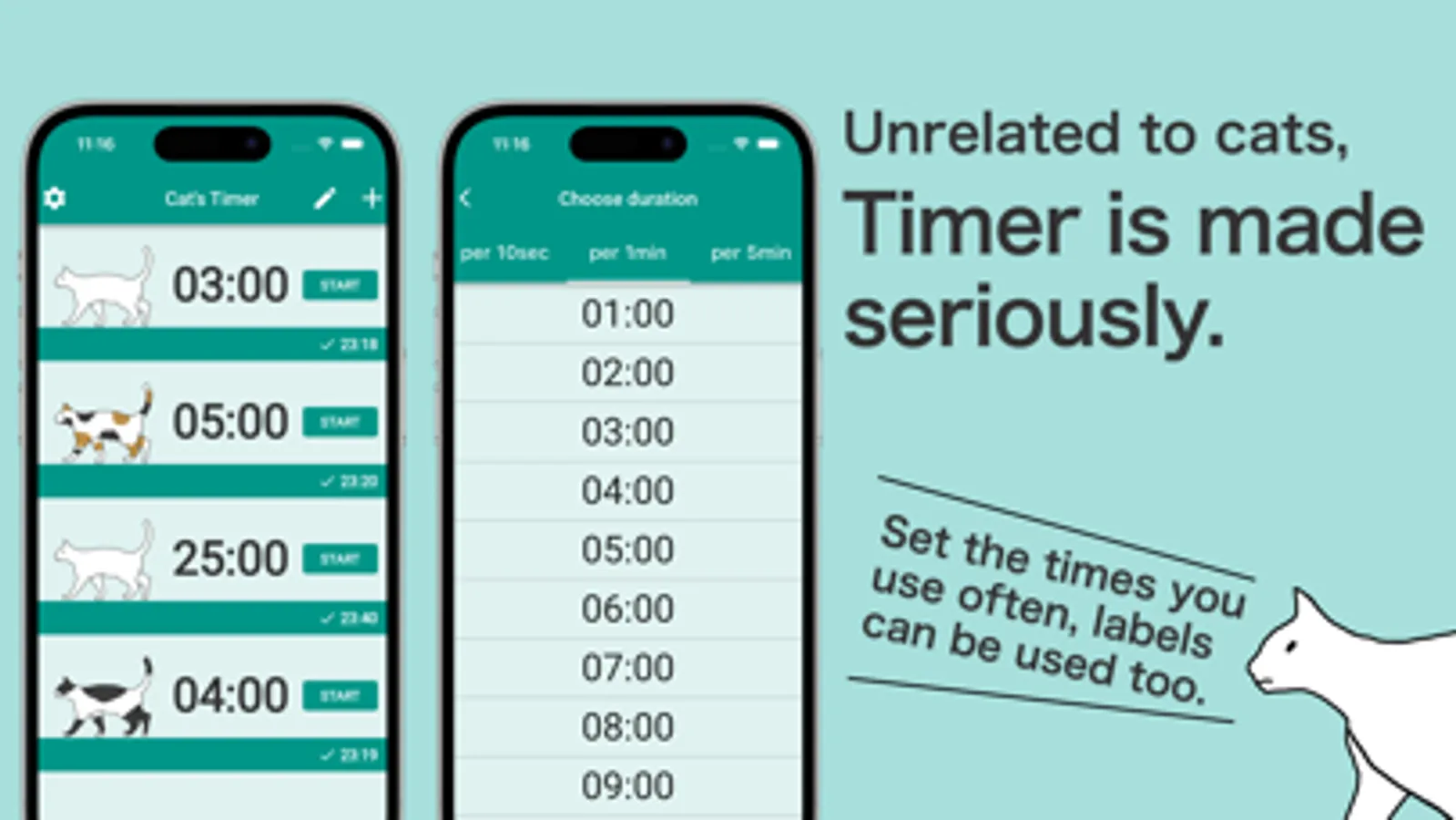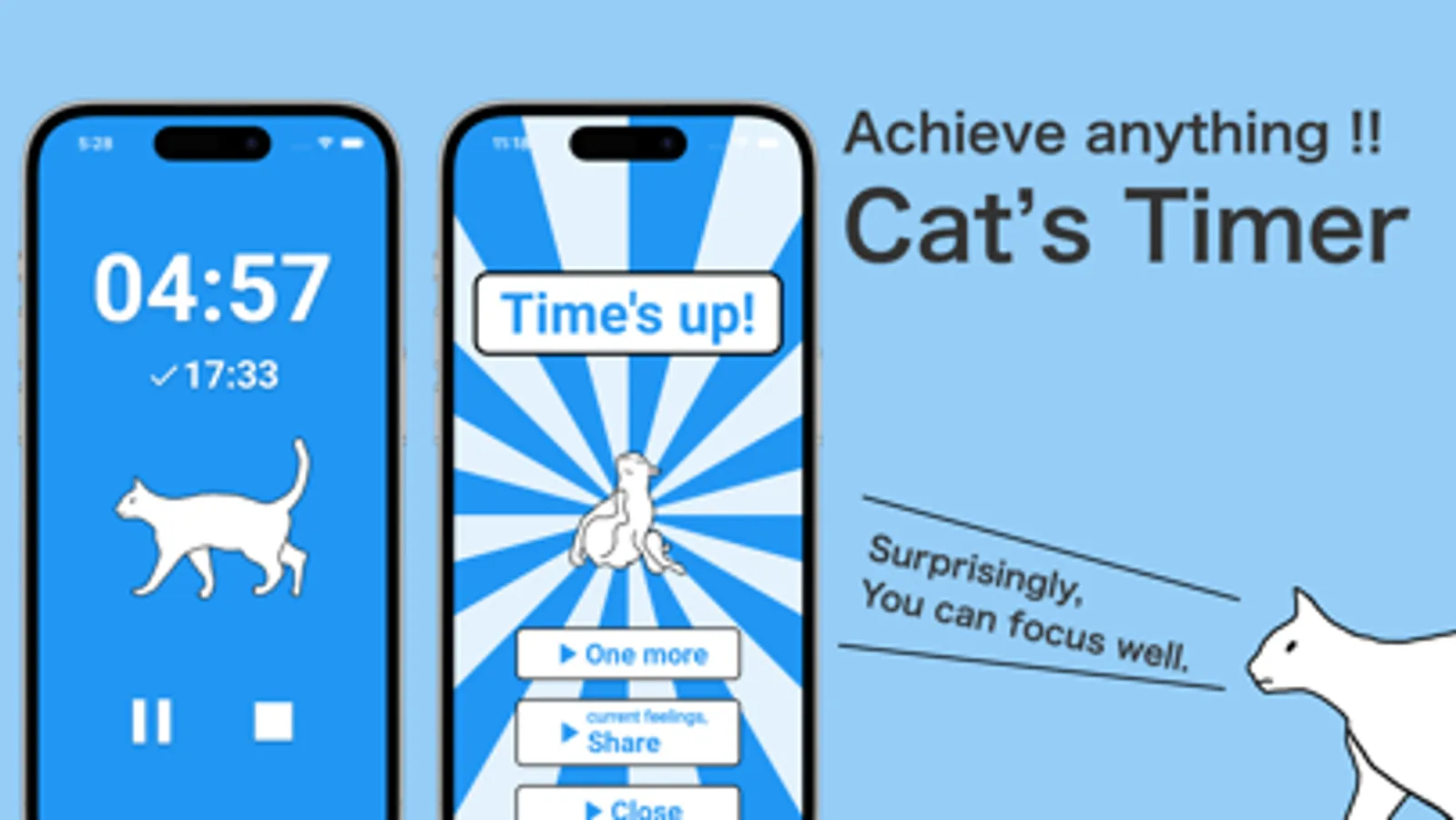 This is a miraculous timer app where stoic cats cheer you on. An unlikely collaboration between cats, who don't understand the concept of time, and a timer app that guides time, is now realized here.