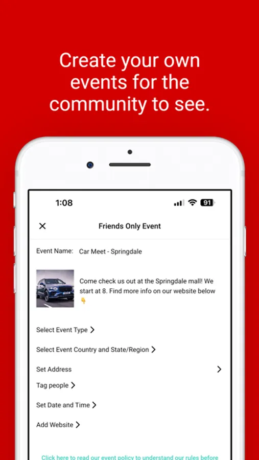 Create events for automotive-related activities such as car shows, off-road events, race events, meetups, or other gatherings, where you can also specify the date, time, and location, and invite your friends by tagging them. You can also search for local events or beyond through your friends list or on the live map.