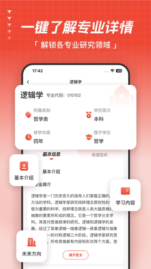 海量专业信息,快速了解专业主干课程、未来就业方向、考研方向、专业男女比例、就业地区助梦理想专业