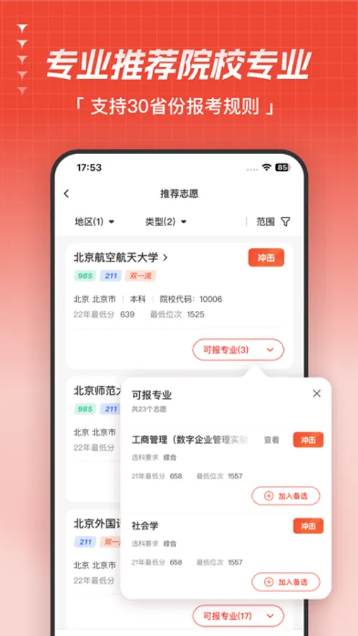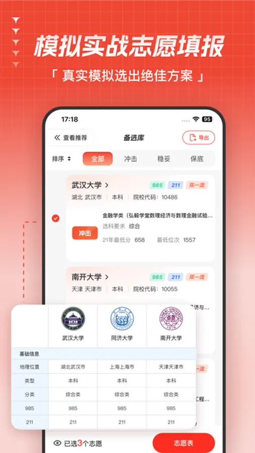 根据高考分数系统自动匹配预估排名,自定义冲、稳、保位次范围,一键导出Excel推荐志愿表,实战模拟高考志愿填报。任意筛选院校地区、院校类别,轻松搞定高考志愿单!