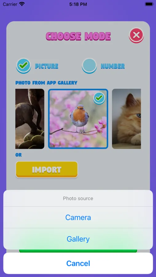 With Photo mode, turn your own pictures into puzzles by selecting a photo, choosing the difficulty level, and sliding the pieces to reveal the hidden image.