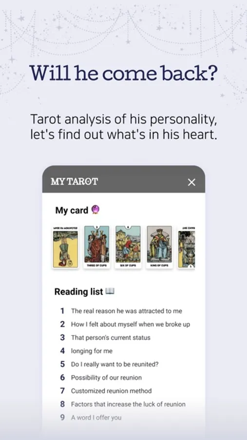 Uncover the secrets of past relationships with our specialized Ex Back Tarot readings. Our intuitive AI provides in-depth insights into:
