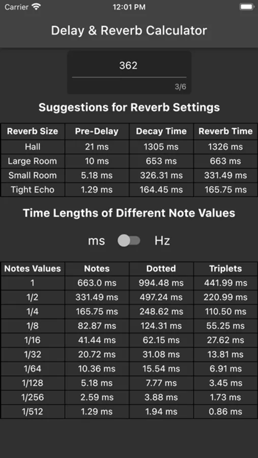 Create the perfect soundscape for your music production with the Delay & Reverb Calculator app. This app makes it easy to calculate delay and reverb times for your tracks, allowing you to achieve professional-sounding results. Simply input the tempo of your track, and the app will generate the exact delay and reverb times for different note values for you. Whether you're a beginner or an experienced producer, this app is the perfect tool for getting your reverb to professionally fit into the vibe of your songs.