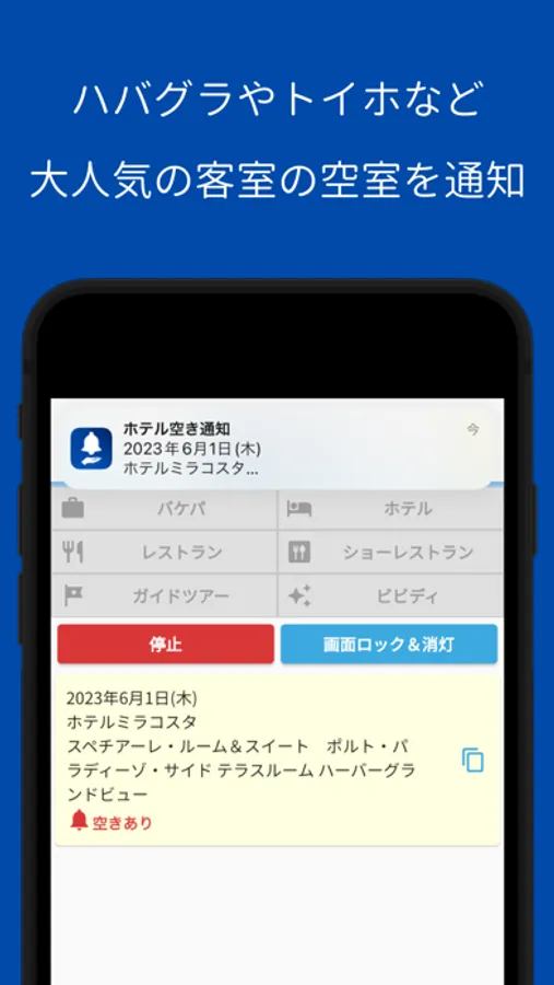 ● ハバグラやトイホなどの大人気の客室の空室を通知!