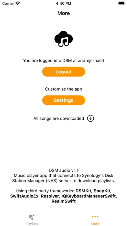 Music player app that connects to Synology's Disk Station Manager (NAS) server to download playlists. Supports streaming from nas and other web sources as well as downloading songs so they can be played without internet connection. Supports playing over bluetooth.