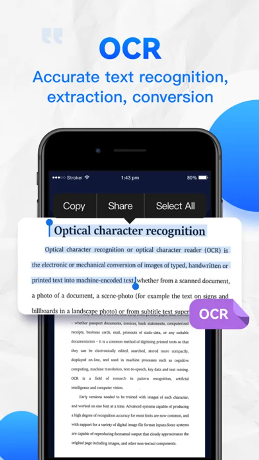 Enables one-click scanning of various documents, images, IDs, etc.; automatically extracts text; accurately recognizes documents; freely edits and converts text.
