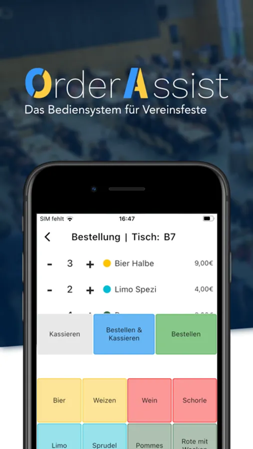 OrderAssist ist ein Bediensystem, entwickelt für Vereinsveranstaltungen in allen Größen. Von der Bewirtung des kleinen Sportheims bis zum großen Feuerwehrfest wird jede Veranstaltung unterstützt.