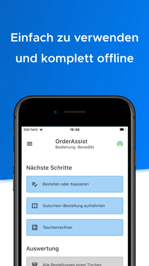 1. Bestellung aufnehmen: Eine Bedienung nimmt über die OrderAssist App eine Bestellung auf. Die Bestellung wird direkt an die Theke und an die Küche geschickt und dort gedruckt.