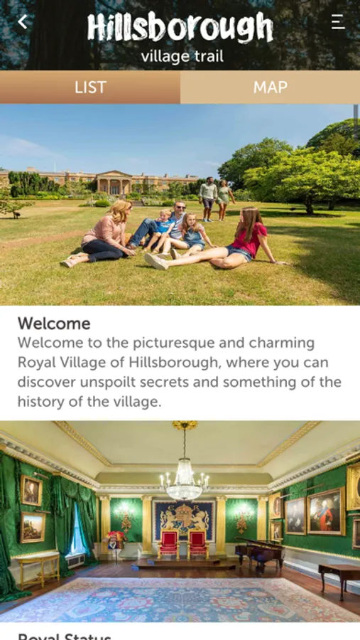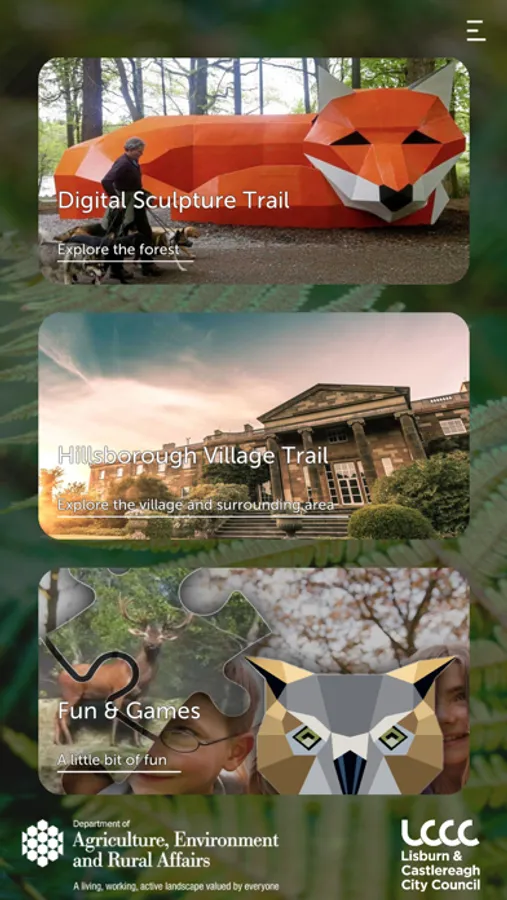 The Hillsborough Forest Digital Sculpture Trail app is a mobile application that is part guided art trail, part step into a digital environment. Narrating a detailed description of internationally gathered artists, their inspiration and history. The Hillsborough Forest Digital Sculpture Trail App allows users to discover information based on questions, digital environment and the spoken word via state of the art multi lingual digital avatars found at each interactive point. The design is user-friendly and straightforward, functioning as a convenient pocket size guide to explore Hillsborough Forest Digital Sculpture Trail.The App opens to an easily navigable menu. Here you will find details of the trail, and the points of interest among them, with ten sculptures that draw their inspiration from Hillsborough and the surrounding area, as well as a range of discounts available from participating eateries within Royal Hillsborough village.This DEARA funded Hillsborough Forest Digital Sculpture Trail App includes interactive gaming technology, fun filters and rewards gathered from your journey throughout the forest. Use the app to explore all the locations at home or while on your travels, choosing your favourites and marking them off as you visit them.