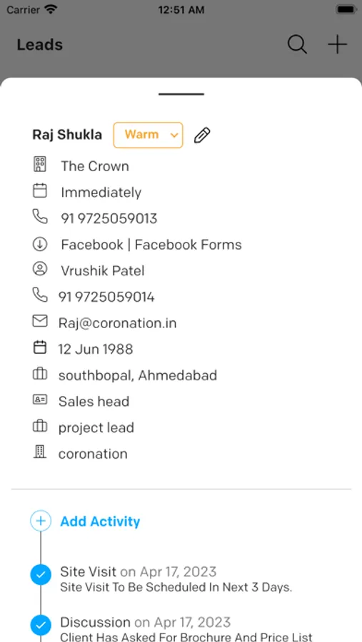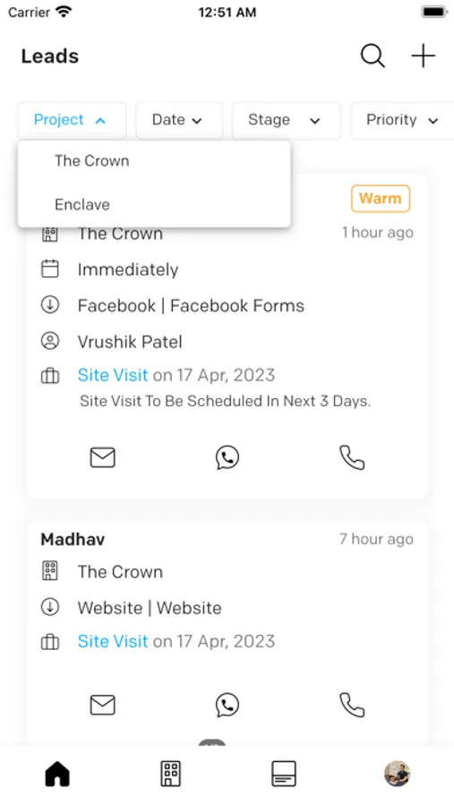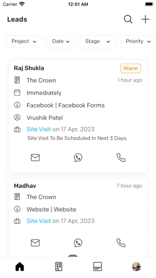 It has the ability to add manual leads for the projects, editing of the leads, adding stage wise followup activity, see inquiry details of the customers and transferring of leads.