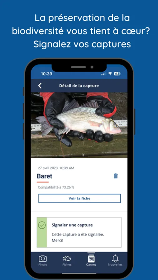 Prenez une photo du poisson qui se trouve au bout de votre ligne par l’intermédiaire de l’application, et iPêche affiche les résultats d’identification les plus probables. Apprenez-en plus sur chaque espèce de poisson présentée dans l’application en parcourant les 125 fiches descriptives présentant la biologie de chacune des espèces, leur carte de répartition et la liste des espèces similaires.