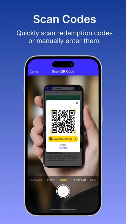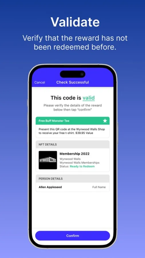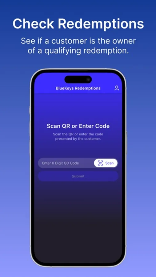The BlueKeys Redemptions app allows BlueKeys Brands' staff to easily validate rewards via QR code scan or manual entry of a 6-digit code. The app verifies active rewards, including memberships, event tickets, and discounts, to make the redemption process seamless.