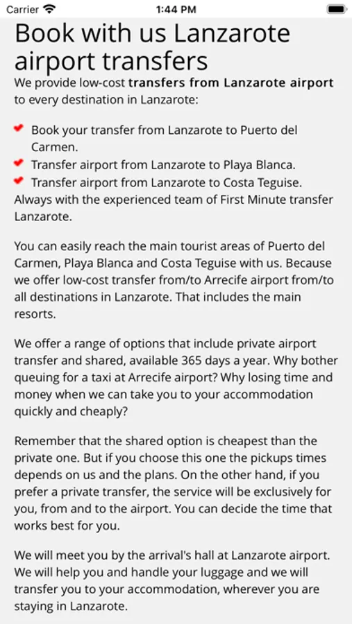 First Minute Transfer offers fast and hassle-free Lanzarote airport transfers, making your travel experience smoother and more enjoyable. Our app allows you to book your transfer in advance, so you can avoid the stress of finding transportation upon arrival. With competitive pricing and a range of vehicle options, including private transfers and shared shuttles, we cater to all your transportation needs. Our experienced drivers ensure your safety and comfort, and our 24/7 customer support team is always available to assist you. With our easy-to-use app, you can track your driver and receive real-time updates on your transfer. We guarantee a smooth and reliable transfer experience, so you can start your vacation stress-free. Download the app now and book your Lanzarote airport transfer with First Minute Transfer.