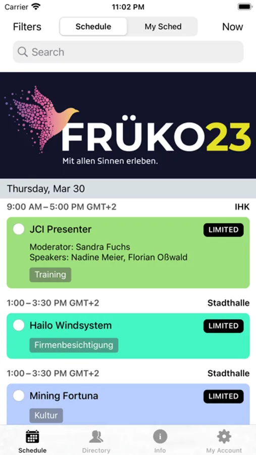 Conveniently browse the entire schedule for FrüKo. Get the key information of your event without ever having to crack open an event guide.