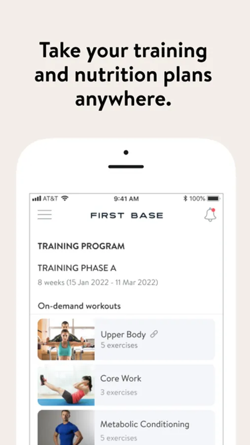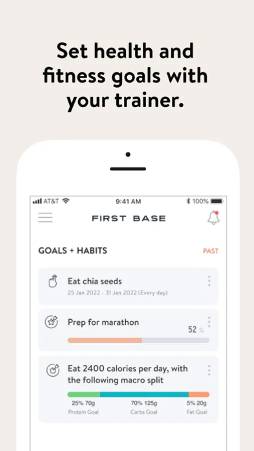 With the First Base App, you will have access to workout programs designed specifically to help you reach your fitness and health goals! You can follow & track your workouts, your nutrition, your lifestyle habits, measurements and results–all with the help of your coach.