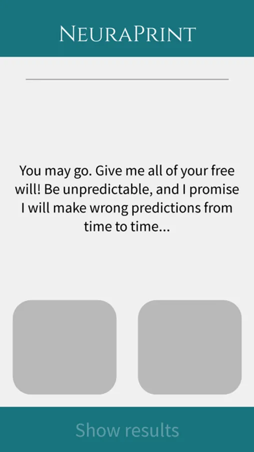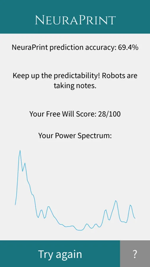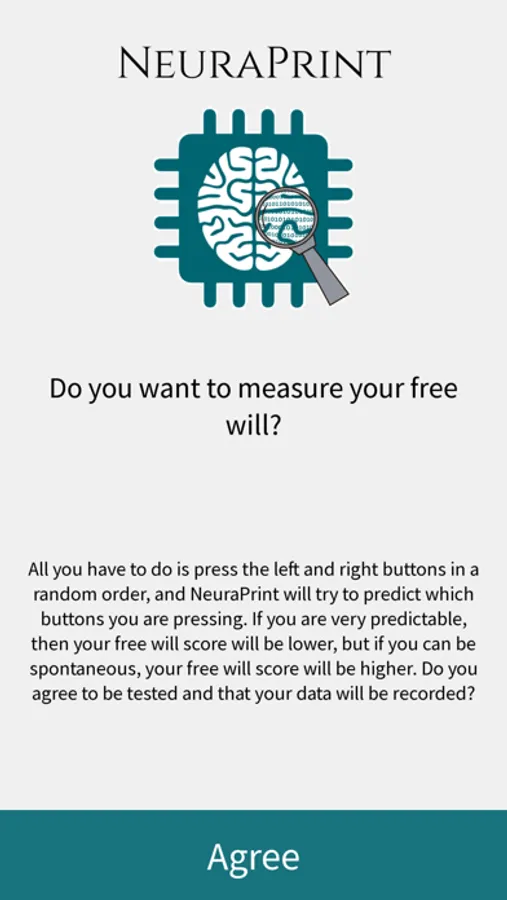 Do you want to measure your free will? All you have to do is press the left and right buttons in a random order, and NeuraPrint will try to predict which buttons you are pressing. If you are very predictable, then your free will score will be lower, but if you can be spontaneous, your free will score will be higher.