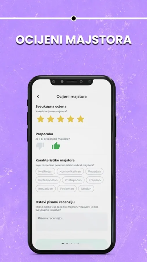 Kada vam zatreba majstor, sve što trebate učiniti jest otvoriti aplikaciju, postaviti oglas s detaljima posla i slikati problem pomoću mobitela. Vaš oglas će biti vidljiv svim majstorima koji rade u vašem području, a oni će moći vidjeti detalje vašeg problema i prijaviti se za posao.