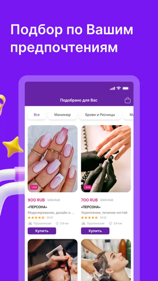 Экономьте на покупках услуг красоты и здоровья в лучших салонах и медицинских учреждениях Москвы и Московской области. У нас каждый день лучшие салоны красоты размещают горячие предложения на бьюти услуги от ТОП стилистов и Парикмахеров со скидками до 90%. Предложения огненные, следи за ними и успей купить сертификат на бьюти услугу или найди свой салон красоты и купи бьюти услугу дешевле чем в самом Салоне. Оставляй отзыв, копи баллы и покупай на них бьюти процедуры себе и своим близким. Мы поможем подобрать лучшее предложение для тебя. Скачай свой электронный БЬЮТИ сертификат на телефон и получи Баллы на покупку первого Сертификата со скидкой 50 %.