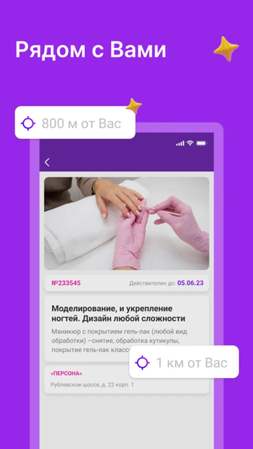 Мобильное приложение содержит сертификаты со скидками на бьюти процедуры. Можно купить сертификат себе или в подарок. Клиенты имеют свой личный кабинет, где смогут посмотреть свои покупки, а мобильное приложение оповестит о сроках использования сертификата.