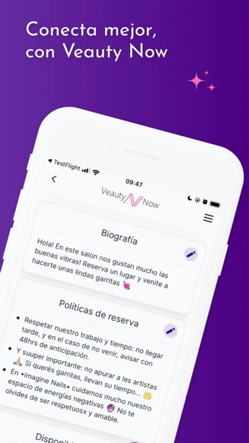 Veauty Now tiene la capacidad de ser personalizada completamente a tu negocio! Da a conocer tu disponibilidad horaria, políticas de reserva, e incluso una biografía, donde puedes contar quién se encuentra detrás de tu negocio.